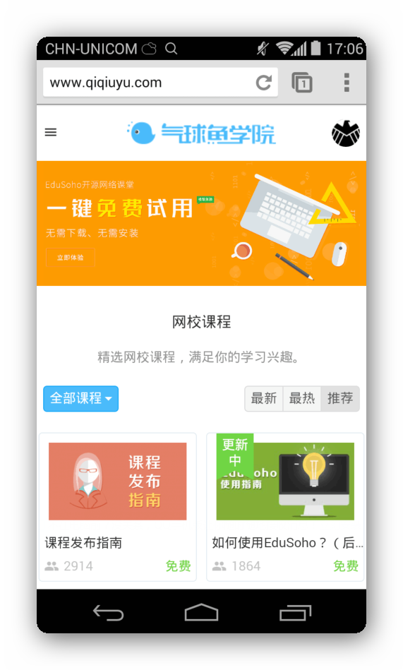 EduSoho移动客户端是基于EduSoho主程序的内容,针对现代人手机使用频繁化,碎片化的特点而进行开发的移动学习工具。他的内容和WEB端主程序无缝连接,学员可以在不同的终端进行学习,真正做到时时学习,处处学习,最大化利用碎片化的时间进行学习活动。