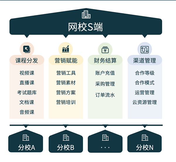 它包含在线教学分发管理、营销招生、教务管理等模块,能够帮助教育供应商快速拓展渠道网校,并实现在线课程分发、营销赋能、财务结算等一站式渠道管理服务。