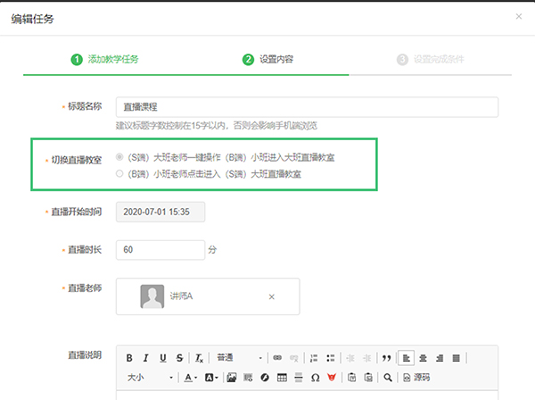 这里需要注意的是,大班和小班之间有两种切换方式,供应商可以在创建课程时根据渠道商的人力配置、教学需求等自行选择。