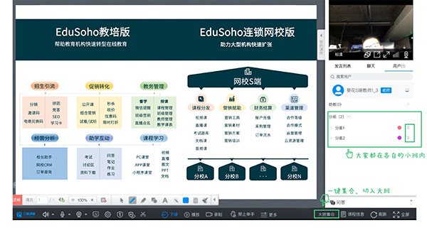 而从供应商的讲师角度来看,如果该门课是由S端掌握主动的,那么上课时即可通过下方的「大班集合」和「分组讨论」按钮进行切换。