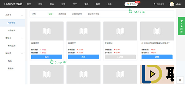 通过EduSoho教培版的管理后台,渠道商就可以前往云市场中选择供应商提供的课程,并一键上线至自己的网校。