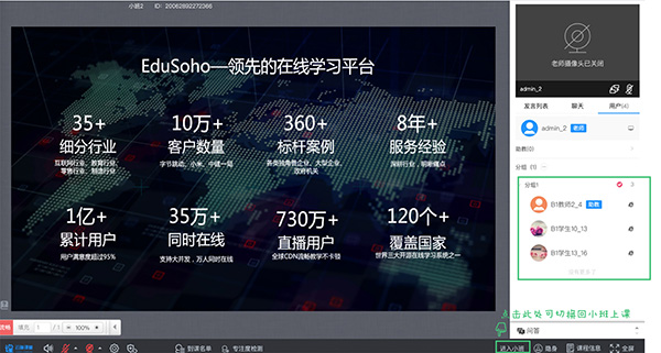 正式授课时,如果该门课程的设置是由渠道商主动切换的,那么小班助教老师就可以提前进入教室,与学生一起完成课前预习、点名等工作,待大班老师授课时,点击下方的「进入大班」和「进入小班」切换教室即可。