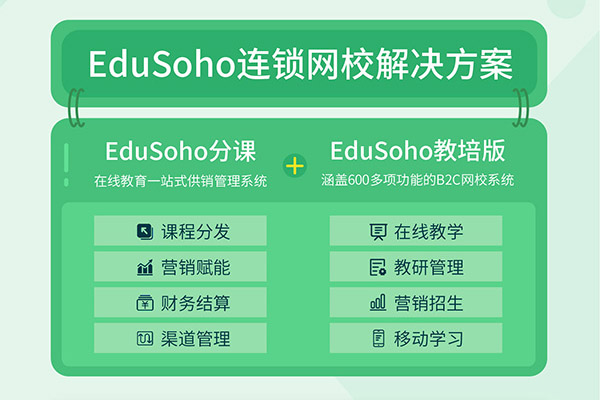 通过和EduSoho教培版的组合,可以形成EduSoho连锁网校解决方案,帮助连锁机构:招商、加盟、经销、代销,助力大型机构快速扩张。