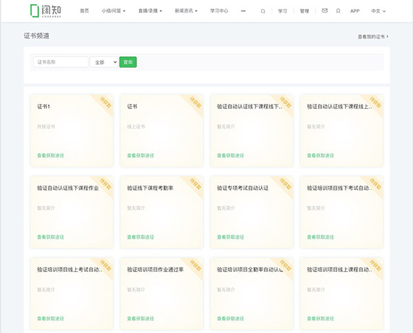 -支持针对线上课程、课程专题、线下课程、培训项目、培训项目模版、专项考试等系统内容培训业务发放认证证书,支持自动判定发放和人工审核发放。