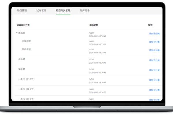 以章节目录的形式将题目进行划分,老师们可以通过「题目分类」将习题归类为不同层级、单元,方便学员进行针对性的刷题训练。