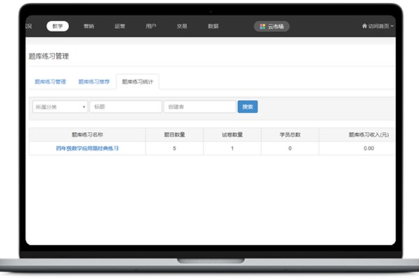 在这里,任意一门题库练习课程的题目及试卷数量、发布状态、推荐排序以及课程收入,都一目了然,清晰直观。