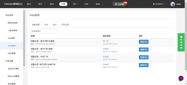目前,EduSoho默认提供了6款主题模板,分别是综合类主题、企培主题、培训机构主题、直播主题、经典主题和轻主题