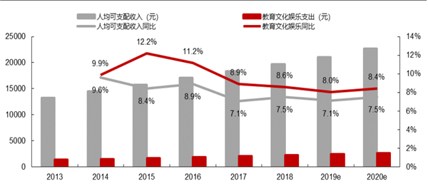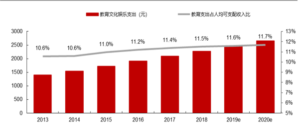 教育支出意愿强劲,K12子行业领涨教育文化支出增速快于人均可支配收入增速。随着中国人均可支配收入增加,中产阶级崛起,对于教育行业支出不断提升,推动整体教育市场强劲发展。2013年人均可支配收入1.3万元,至2020年预计人均可支配收入2.3万元,年复合增长率8%。人均教育文化娱乐2013年0.14万元,预计2020年达0.27万元,年复合增长率达9.6%,快于人均可支配收入,人均教育文化娱乐支出占人均可支配收入持续上升,预计2020年为11.7%vs2013年10.6%,增加1.3个百分点