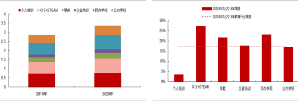 K12行业受人口红利及覆盖率影响增长强劲。据德勤预计2018年中国教育市场规模为2.86万亿元,至2020年预计总体规模达3.36万亿元,年复合增长率12%,各子行业增速表现不一,K12+STEAM、民办学校、早教行业、企业培训、公办学校及个人培训增速分别为27%、23%、21%、17%、17%及3%,其中K12+STEAM主要表现为K12人口红利增长及覆盖率提升。民办学校规模增长主要由民办幼儿园带动,民办学校及早教增长由学前人口红利带动。