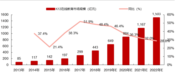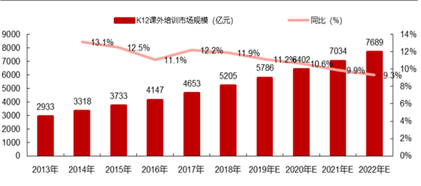 介于中国中、高考选拔制度以及低录取率,导致K12课外辅导依然是教育领域中需求最为强劲的细分赛道,且市场空间巨大。据Frost&Sullivan报告,我国课外辅导市场2018规模达5205亿元,增速11%,其中在线教育行业规模约为443亿元,增速48%。到2020年预计课外辅导市场达7689亿元,复合增长率达10%,其中影响行业规模主要因素包括K12人口基数、参培率及单用户费用三个因素。