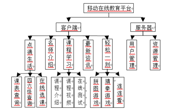 基于 Android 的移动在线教育平台中用户角色有两大类:学员和管理员。学员在该平台注册为会员,然后可以凭借账户和密码登录该教育平台,使用平台中的所有资源,包括课程学习、在线测试、相关的一些资讯以及休闲小游戏。管理员可以通过服务端进行相应课程资源、测试资源和资讯的更新。这里我们建议教育平台的功能模块可以如下图设计