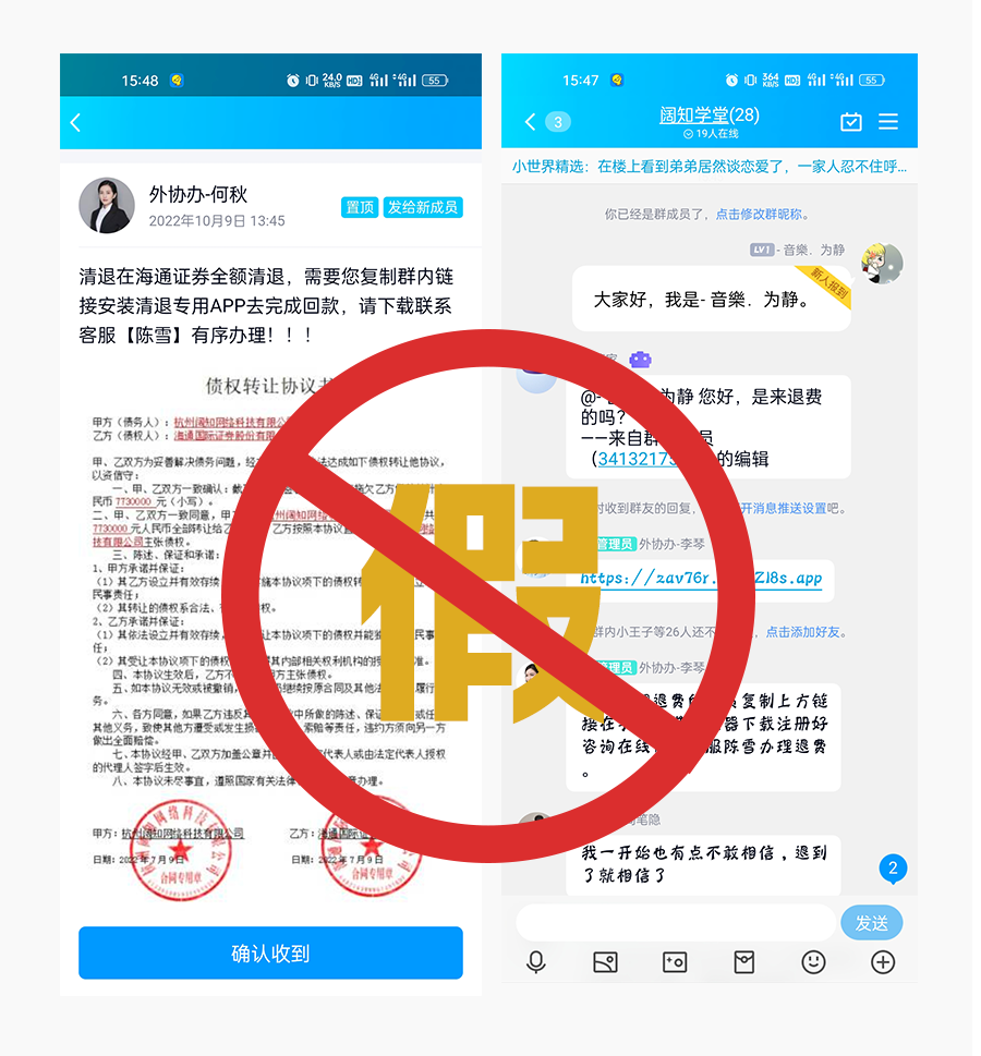 期间借助互联网散播诈骗信息,甚至采用伪造文件等卑劣手段诱导学员点击链接、下载第三方App或转账达到谋取钱财的利益!