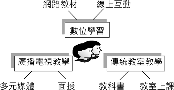 1列出常见的几种学习方式,一般人最熟悉的应该是传统教室教学的模式,有教科书与老师发的讲义,老师在教室里头进行讲授、实作、互动与评量等教学活动,课后也会有办公室时间接受同学的问题,同学透过校园中的各种设施来帮助学习,例如图书馆、实验室等。