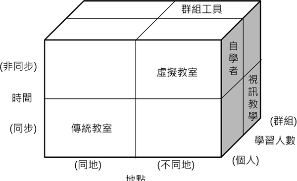 图1表示出老师与学习者之间的各种互动方式,我们可以通过这样的模型从时间、地点与参与人数的角度上来观察在线教育与传统学习。从时间的角度来看,在线教育的参与者 ( 即老师与同学 ) 可以同时上线,在在线教育平台上进行互动,例如直播教学就是这种情况。