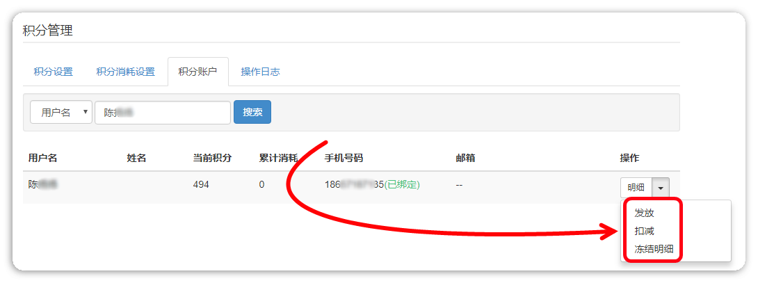 管理员可给某一用户发放积分或者扣减积分或者冻结积分。
