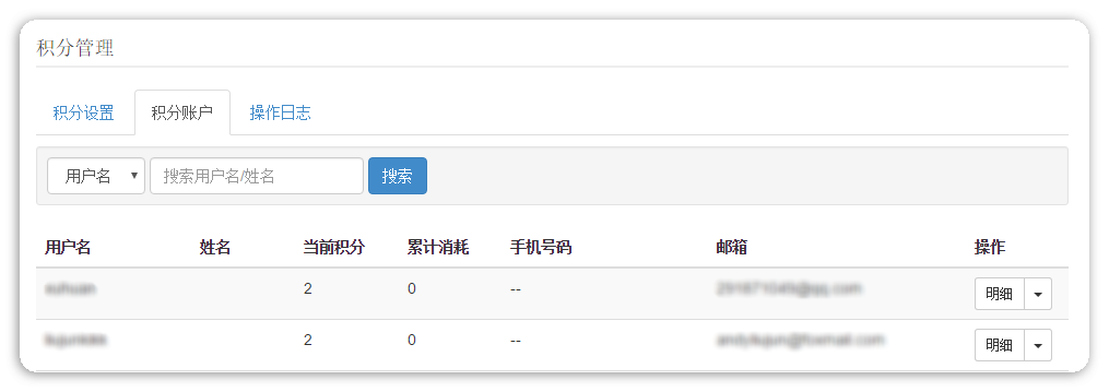 路径:【管理后台】-【运营】-【积分账户】,可查询某一用户的积分情况。