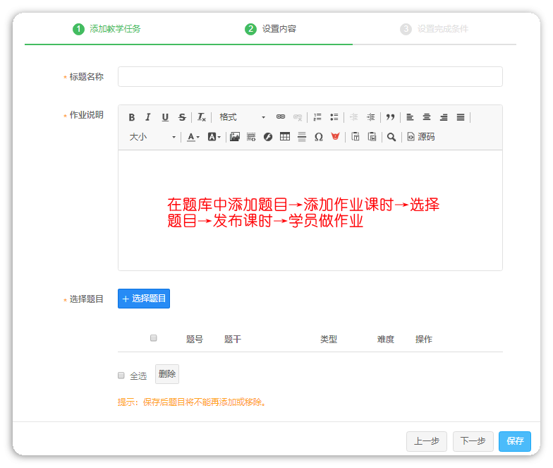 1、必须在课程题库中添加题目之后,然后添加作业课时,才能选择题目;