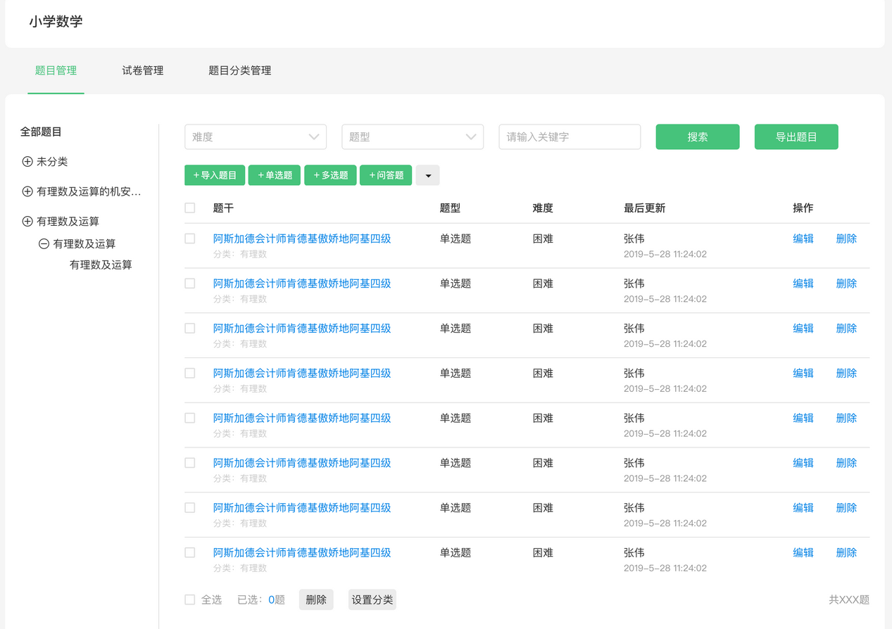每个题库都可以创建一套题目分类,支持三级,只作用于本题库。注意此处与题库分类的区别,题库分类作用于题库,而题目分类作用于题目。