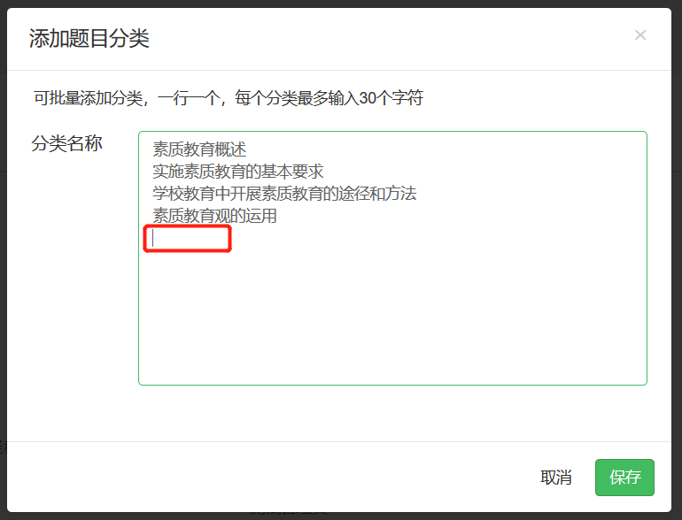 添加题目分类和子分类时,可以批量添加,一行一个,每个分类最多输入30个字符。从Word或Excel中复制过来时,注意底部不要产生多余的空行,如下图红色框所示。