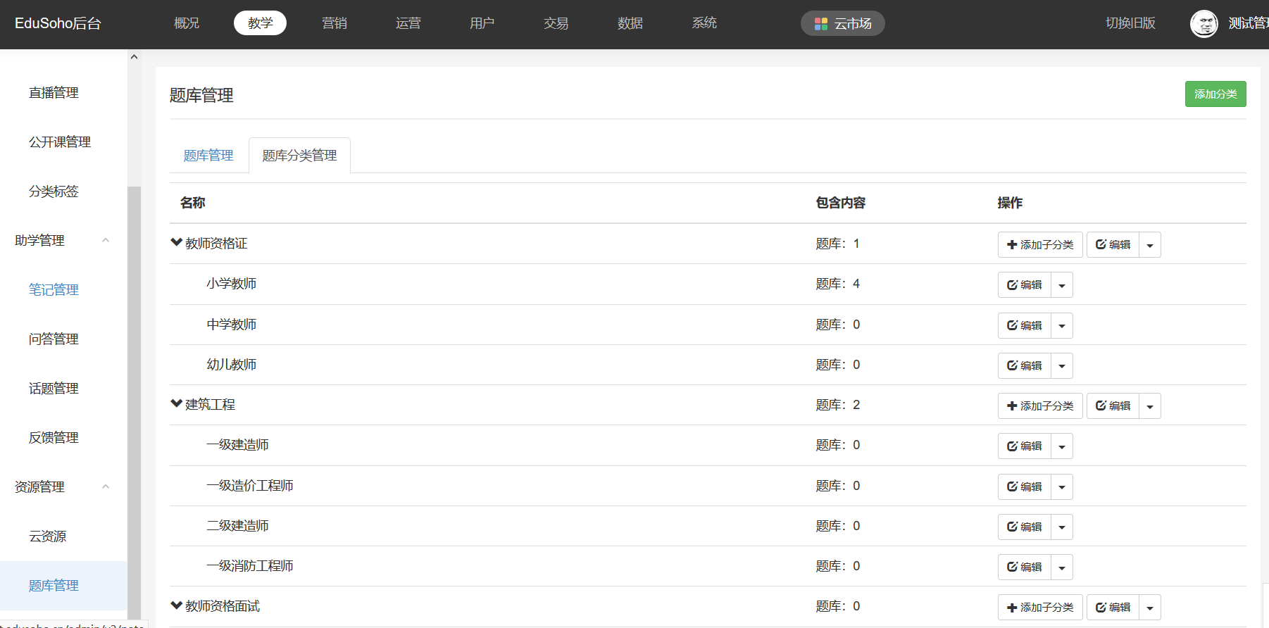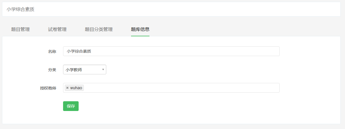 用户可在此管理题库的名称、分类和授权教师。