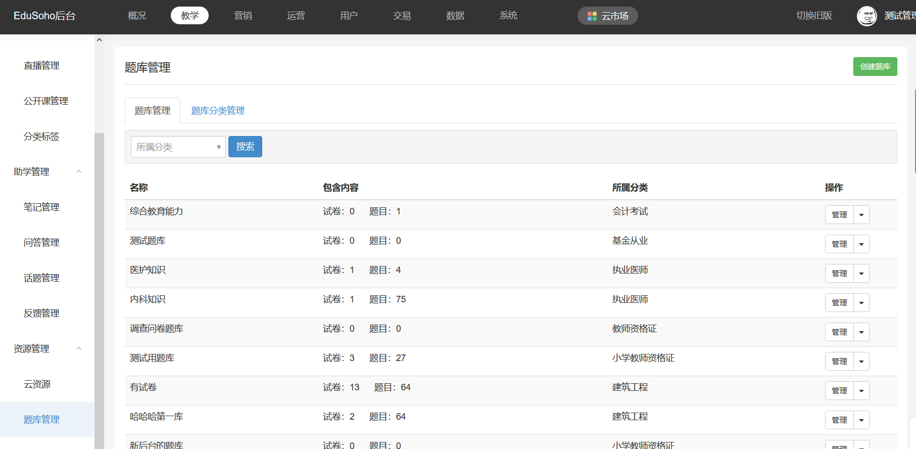 用户可在此创建以及管理题库。点击“管理”按钮,即可管理该题库中的题目和试卷。