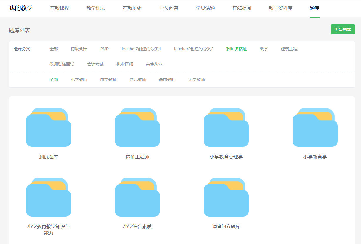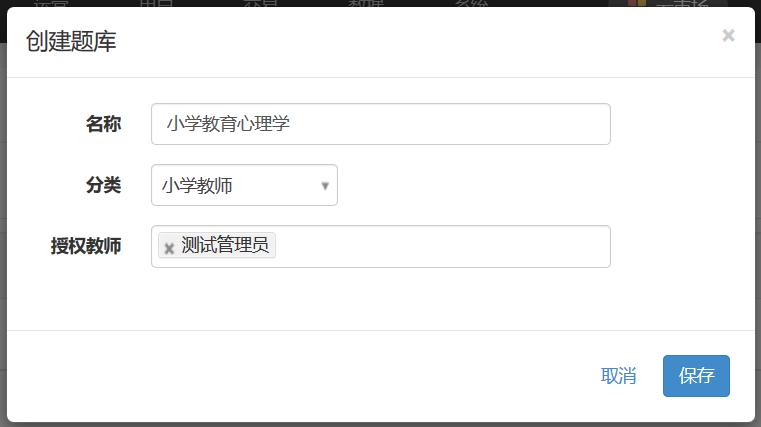 创建题库时,可以设置分类和授权教师。