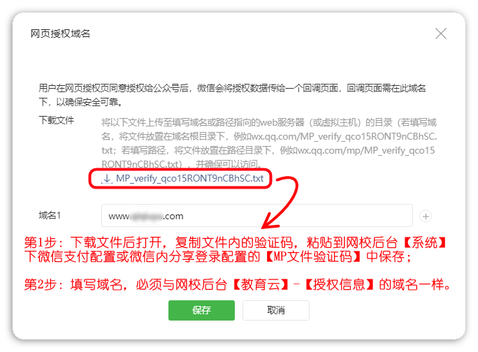 将验证码保存到【管理后台】-【系统】-【用户设置】-【登录】-【微信内分享登录接口】-【MP文件验证码】中,填写后务必点击页面最下方【保存】。