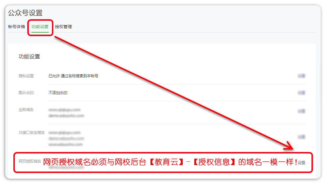 操作路径:微信公众平台(服务号)的左侧导航栏【公众号设置】-【功能设置】-【网页授权域名】。