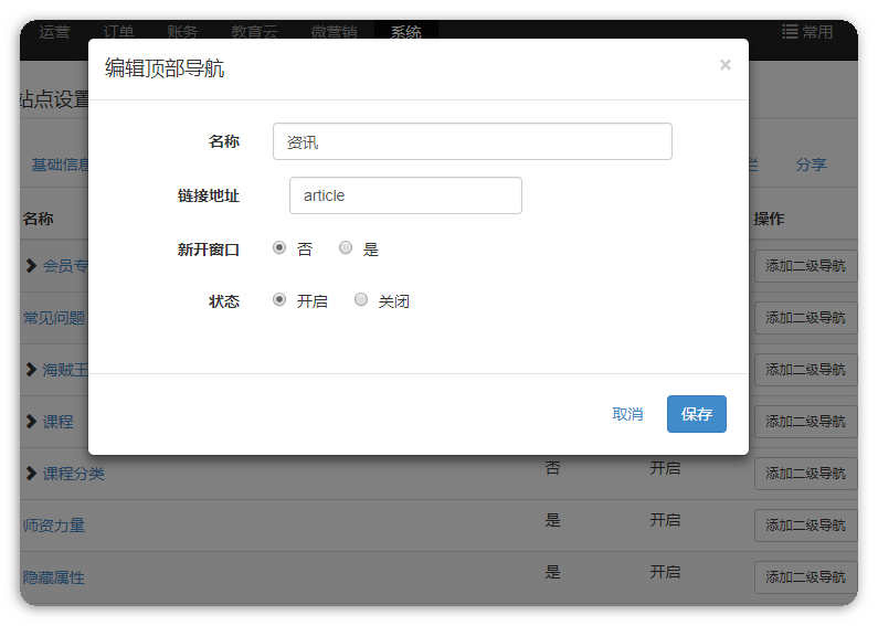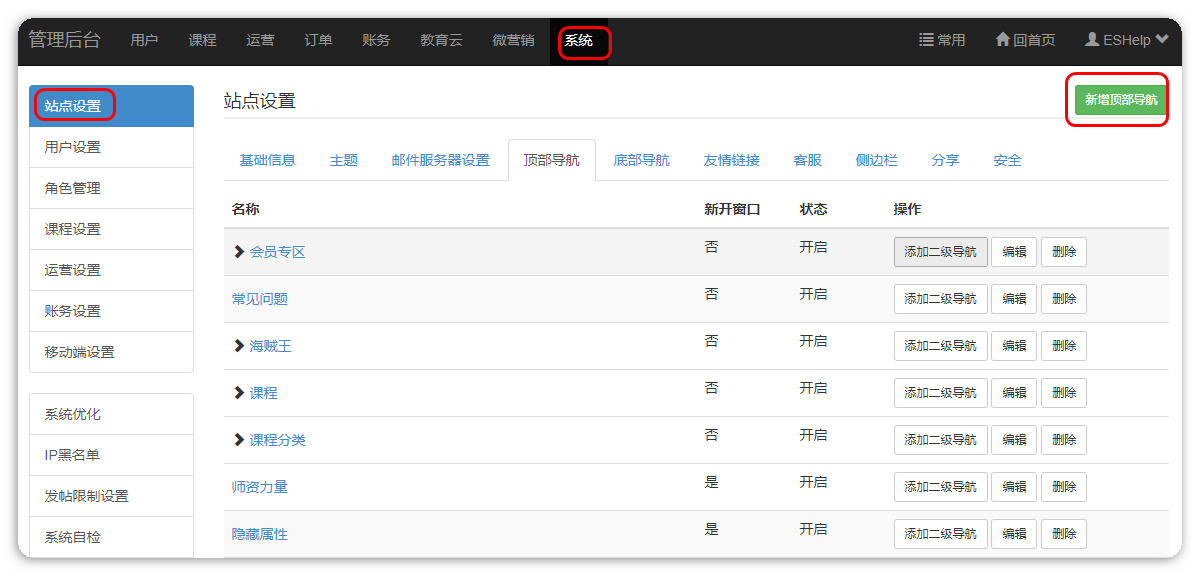 路径:【管理后台】-【系统】-【站点设置】-【顶部导航】