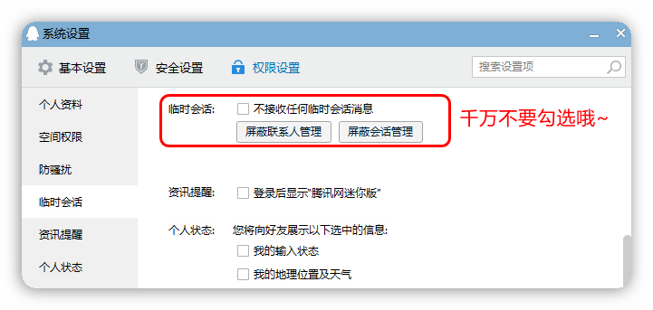(2)在“权限设置”——“临时会话”——把“不接收任何临时会话”的勾去掉。