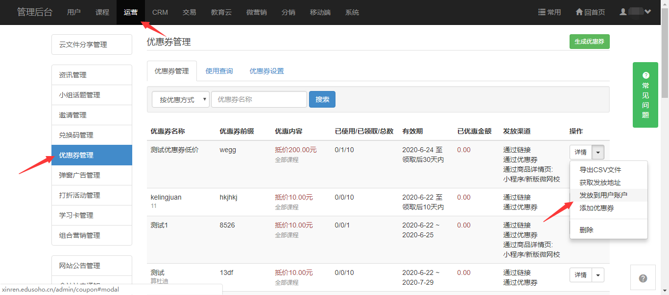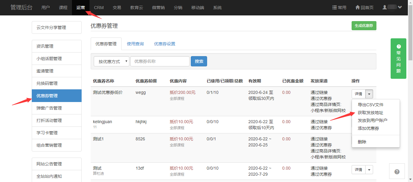 【管理后台】-【运营】-【优惠券管理】-【详情】-【获取发放链接】,直接把链接发给学员,学员点击后登录网校账号即可自动领取优惠券;一个账号只能领一次,点击多次会提醒已领取。
