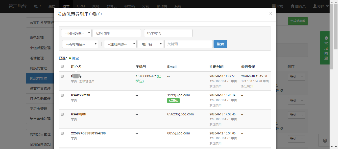 【管理后台】-【运营】-【优惠券管理】-【详情】-【导出csv文件】;