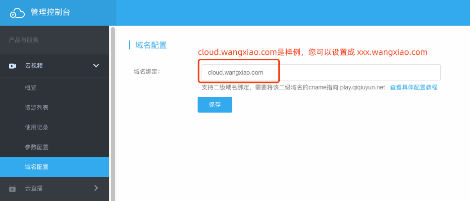 2.在左侧菜单栏选择“域名配置”,填入网校的二级域名,如下图所示: