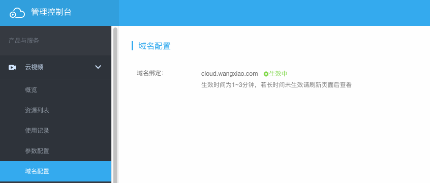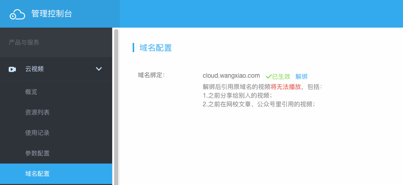进入“域名配置”页面,若域名当前处于已生效状态,则可点击“解绑”按钮,解绑后引用原域名的播放请求都将无法播放。