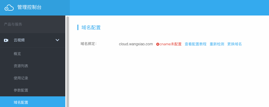 1.准备一个未使用的二级域名,假设网校域名是wangxiao.com,则准备一个cloud.wangxiao.com,并添加CNAME记录解析。