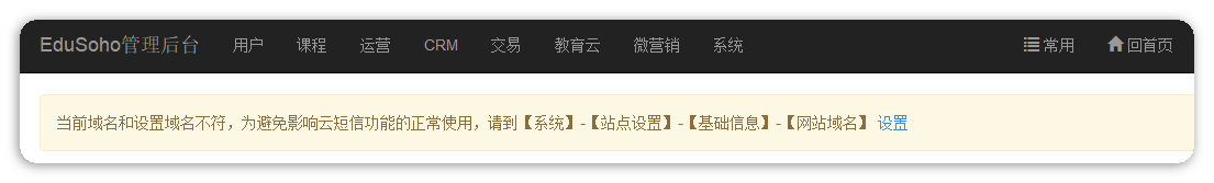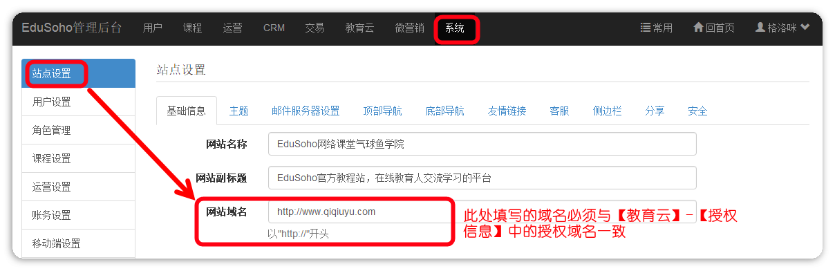 2、如果是管理后台首页提示“授权域名不符”,请在【管理后台】-【系统】-【站点设置】-【基础信息】-【网站域名】中修改域名。