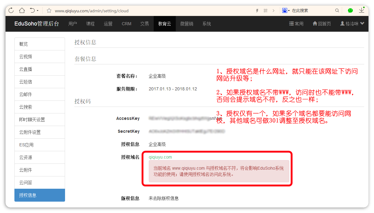 1、如果是升级系统或者【管理后台】-【教育云】-【授权信息】中提示”授权域名不符“,请以【授权信息】中的域名访问网校,如果域名有变更,商业客户可联系运营人员,开源版域名绑定后就不再支持自行更换,如需更换,请联系客户经理或官网在线客服。