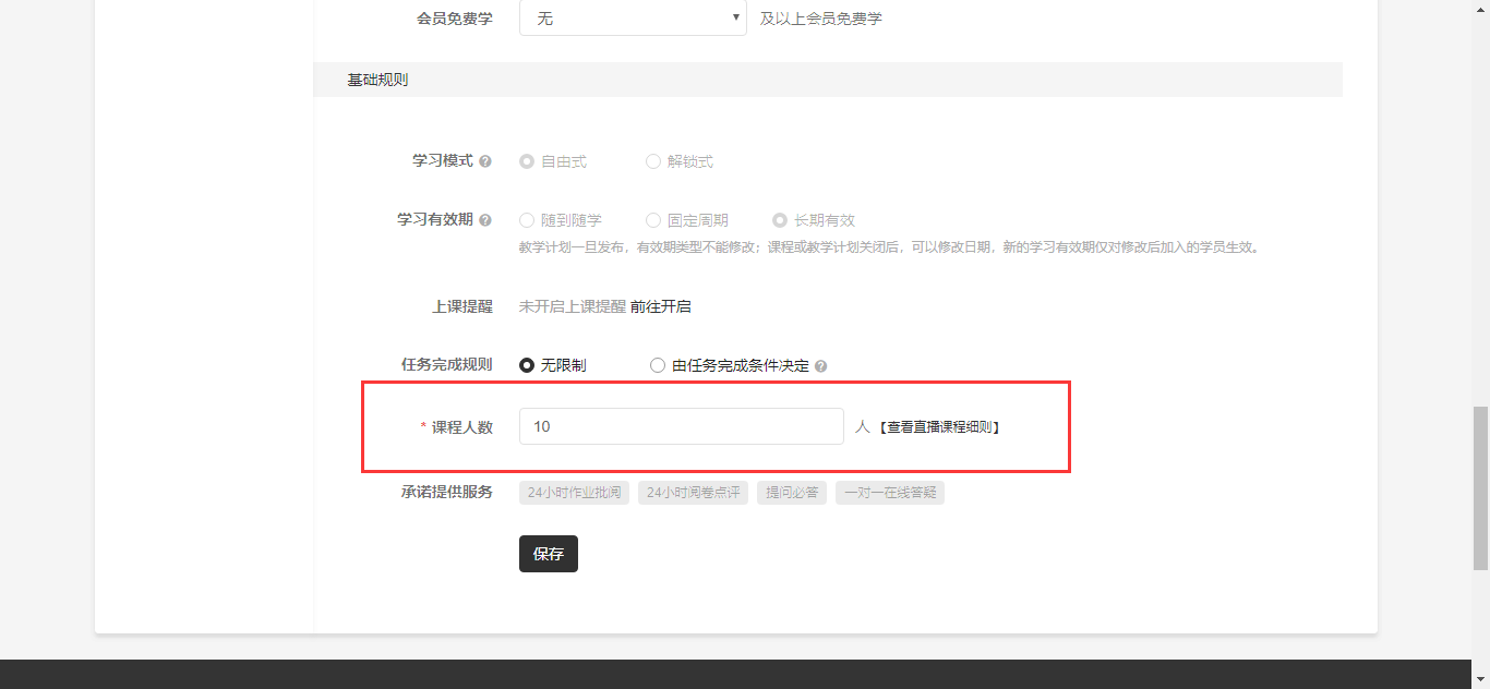 【注意】:普通课程不能设置课程人数,只有直播课程可以设置。