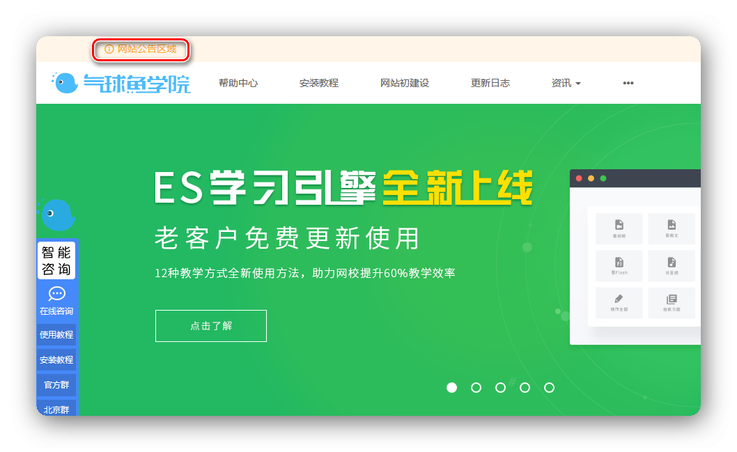 1)网站公告是网站通知,显示在网站顶部导航上方,位置显眼,可编辑文案,设置链接,点击条状。此功能可用作活动宣传或者课程推广。