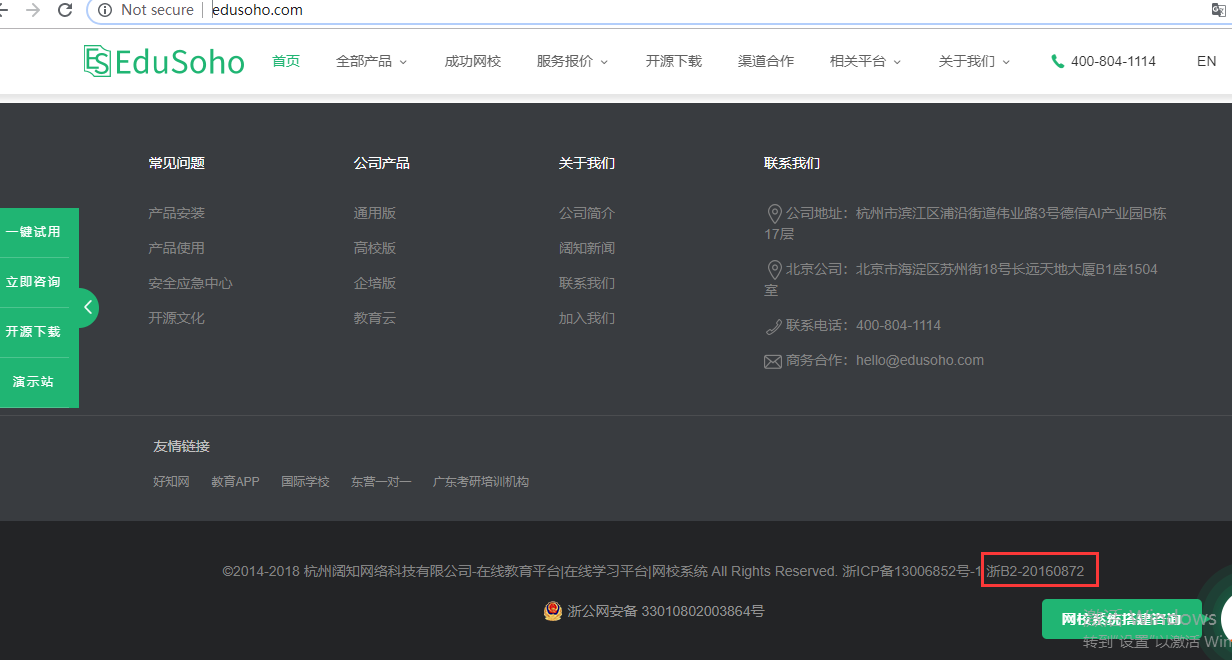 例如:http://www.edusoho.com/ 点击可进入(添加方法可参考:http://www.qiqiuyu.com/faq/814/detail 如何将公安备案图标和编号添加到网站底部?)