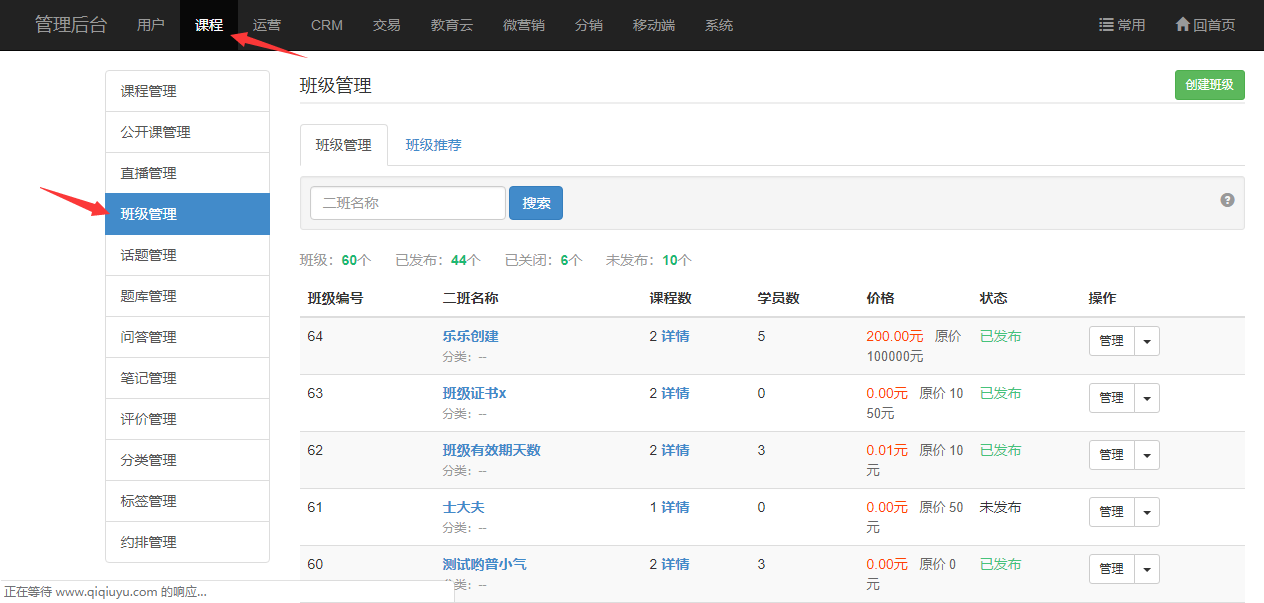 未发布班级可以直接删除; 已发布班级只能关闭不能删除,可以修改班级的信息; 已关闭班级不能删除。 路径:【管理后台】-【课程】-【班级管理】。