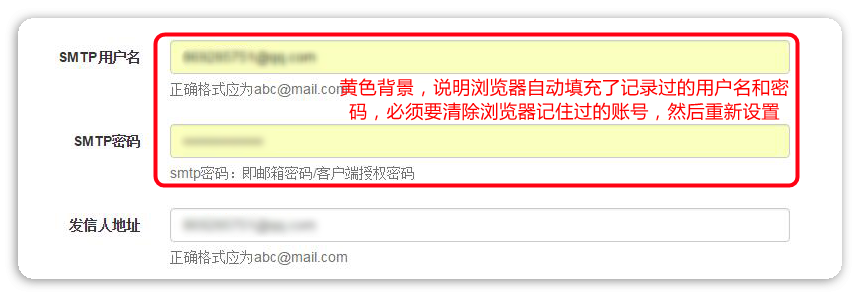 6、邮件发送失败,如果邮箱在网站登录并让浏览器记住过密码,用同一个邮箱配置邮件服务器,有可能是浏览器自动填充SMTP用户名和SMTP密码,出现黄色背景,必须要清除浏览器记住的网站账号之后,才能配置。