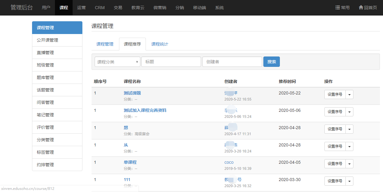 路径:【后台管理】-【课程】-【课程管理】-【推荐课程】-【设置序号】