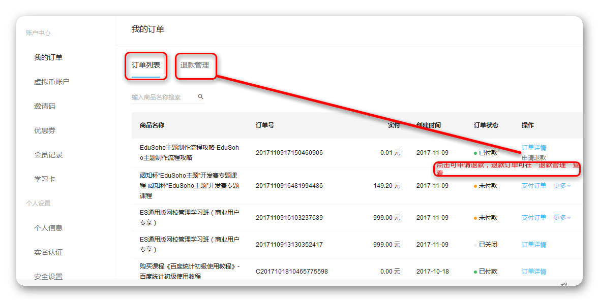 申请退款路径:【账户中心】-【我的订单】-【订单详情】