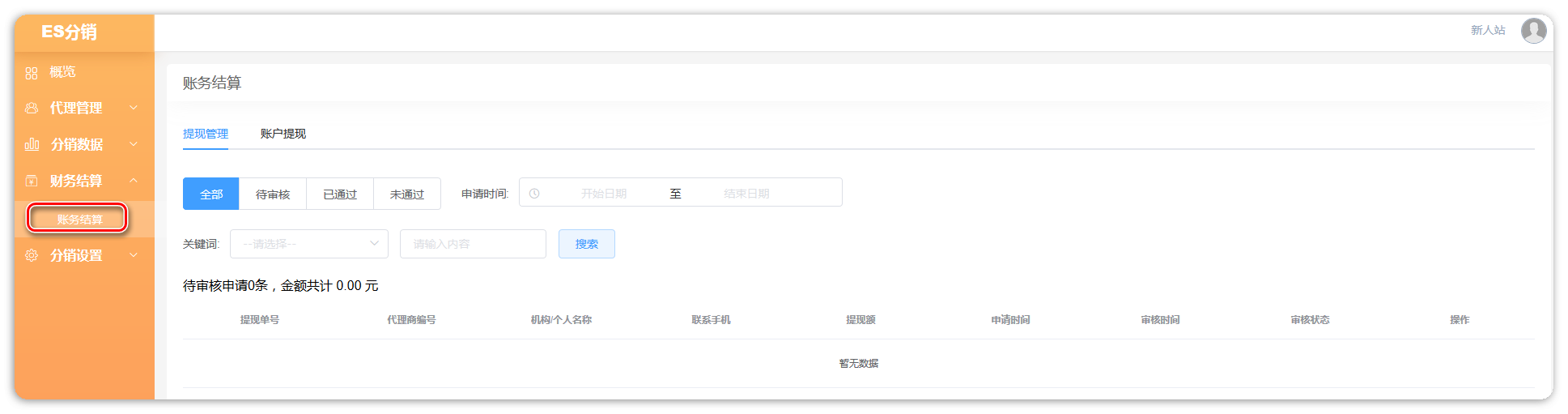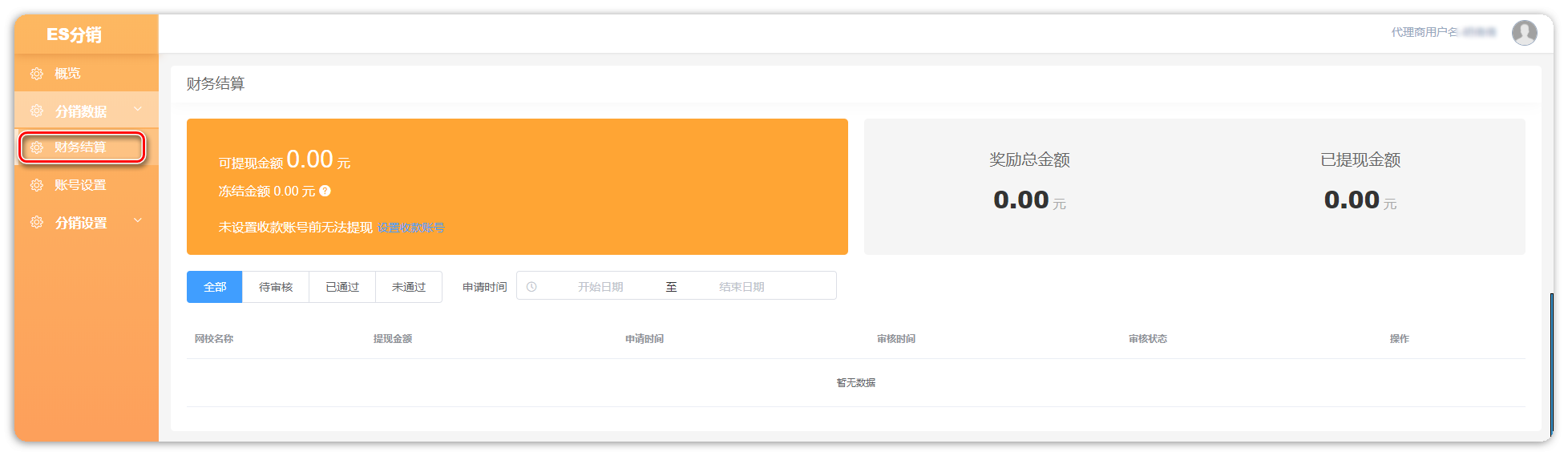 提现管理页面可以查看到网校内不同代理商的提现审核单,网校可以操作通过和拒绝,目前此处只做一个数据记录功能,实际钱款由网校线下打款给代理商。