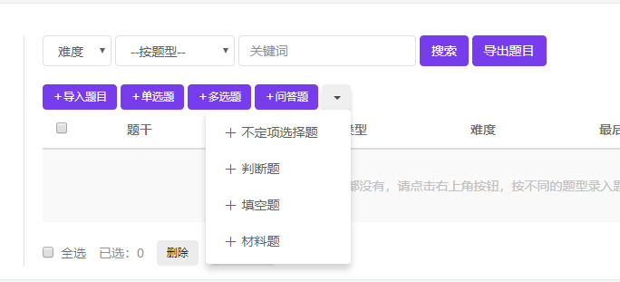 单项选择题、多项选择题题、不定项选择题、填空题、判断题、问答题、材料题。