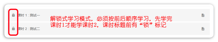 2、解锁式学习:学员必须根据课时列表顺序开始学习,学过了课时1才能学课时2;