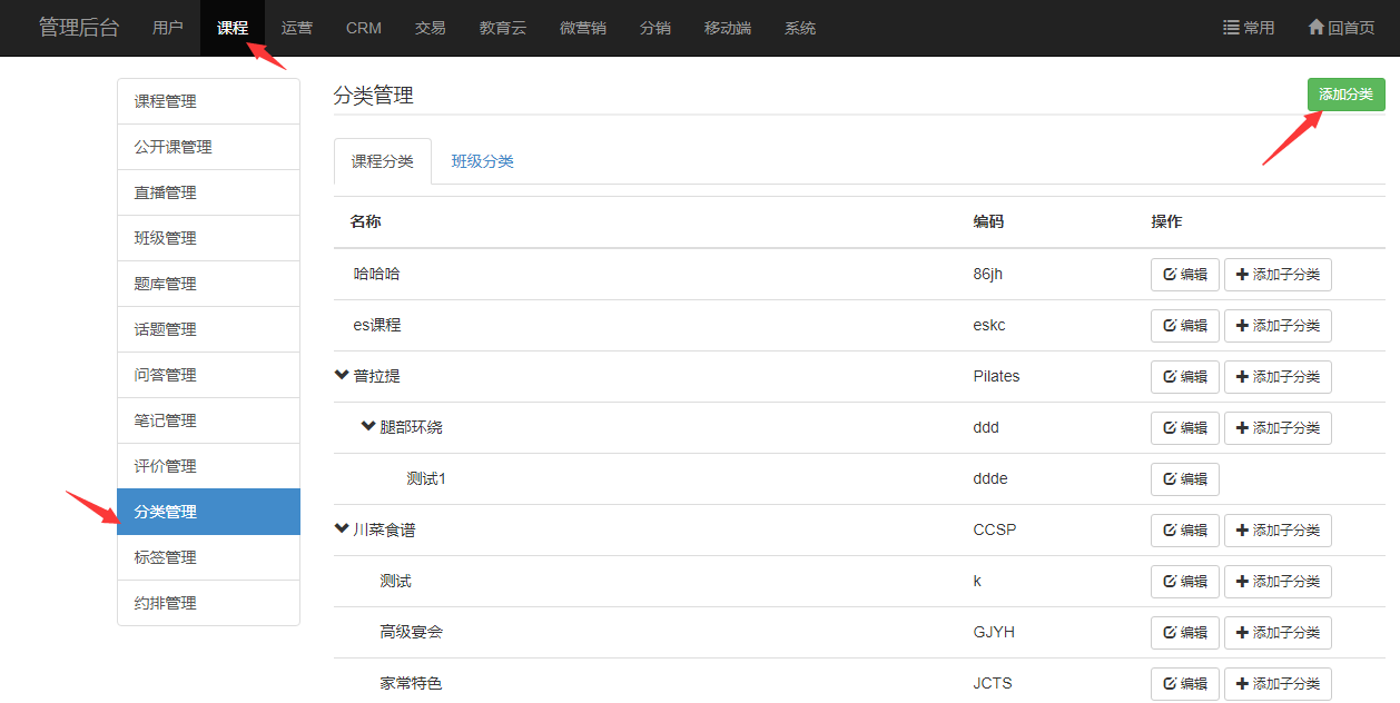 路径:【管理后台】-【课程】-【分类管理】-【课程分类】-【添加分类】,根据提示操作即可。