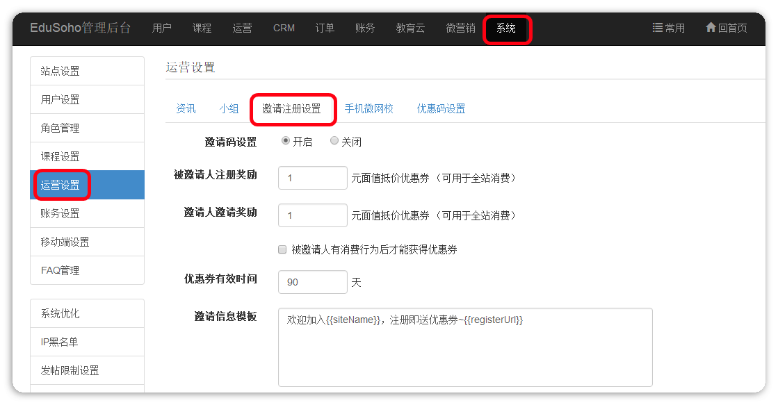 路径:【管理后台】-【系统】-【运营设置】-【邀请注册设置】