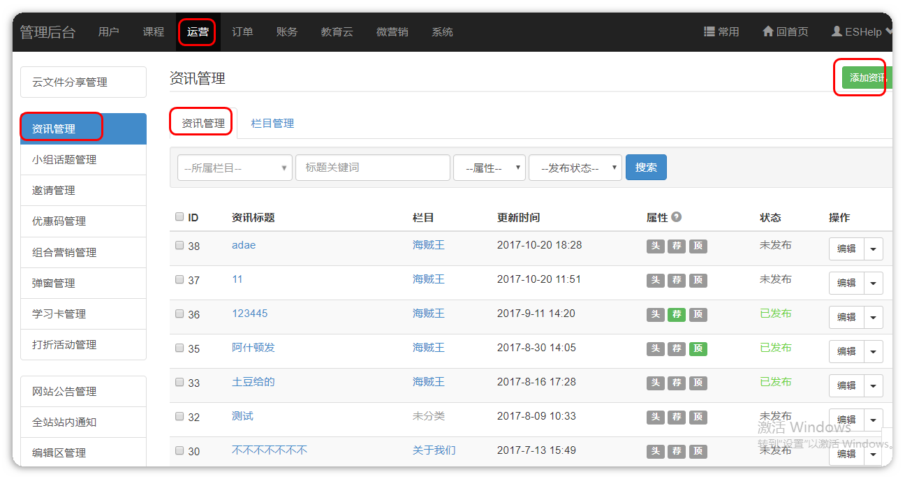 路径:【管理后台】-【运营】-【资讯管理】右上方【添加资讯】。